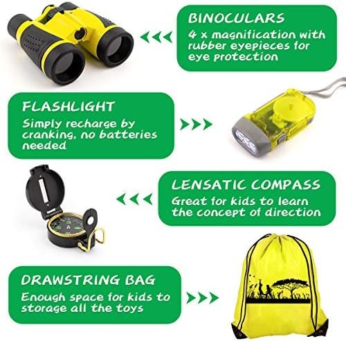 Made of Non-toxic, BPA free plastic material, safe for your kids to play.The self-powered flashlight can recharge itself each time when you crank its handle, no batteries required.Not only let children go outdoor and learn from surroundings, but also a chance for communicating with parents or friends.Your child will enjoy to be a explorer, identifying direction with compass, watching birds with binoculars, observing insects with magnifying glass and etc.