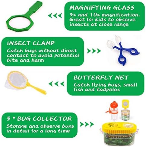 [Learn about Bugs & Insects] – 4 x magnification for examining plants, insects, and rocks. Wonderfully fun for camping trips and outdoor or indoor investigations. Use the insect clamp and butterfly net to the catch insects you are interested in. Kids don’t have to touch the bugs. And bug collectors can make small bug accompany you for a longer time.