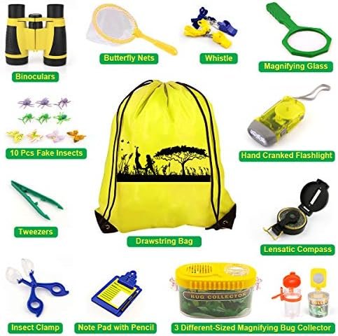 [24 PCS Outdoor Explorer Kit] – Kaqinu kids adventure kit provides with 24pcs necessary explorer accessories including binoculars, compass, whistle, flashlight, magnifying glass, butterfly net, tweezers, insect clamp, bug collector, fake insects, note pad and drawstring bag for easily carrying outside and storage. A camping essentials for kids.