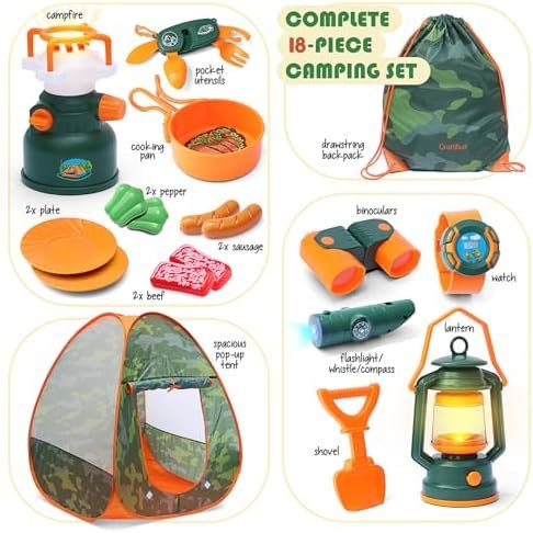 Camping Essentials: This set includes 17 must-have items for young campers and hikers to kick off their outdoor adventures. It features a battery-powered pretend gas stove and oil lamp, binoculars, a utility knife, a multifunctional whistle, a cooking pan, plates, a shovel, a pop-up tent, and more!